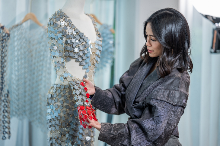 “สิ่งสำคัญในการออกแบบชุดนี้ คือการหยิบเอาแรงบันดาลใจจาก Avatar: Fire and Ash มาใช้ โดยเฉพาะสี แสง และความโดดเด่นของตัว ‘วารัง’ (Varang) หัวหน้าเผ่าไฟในเรื่อง โดยเลือกใช้สีเทาที่เป็นสีของเถ้า (Ash) รวมถึงสีฟ้าที่เป็นเบสหลักของ Avatar และด้วยความที่วารังเป็นหัวหน้าเผ่าไฟ เราเลยใช้สีแดงเป็นอีกหนึ่งสีหลักในผลงานชิ้นนี้ ซึ่งทั้งสีเทา สีฟ้า และสีแดง เป็นสีของฝาขวดน้ำพลาสติก 100% ไม่มีการใส่สีเพิ่มเข้าไปเลย นอกจากนี้ยังมีสีโอ๊ต (Oat) ที่ทำจากกล่องพลาสติกใสใส่อาหารซึ่งเราใช้เป็นตัวเบสสี รวมแล้วทั้งชุดนี้เราใช้ฝาขวดน้ำพลาสติกและกล่องพลาสติกใสใส่อาหารมาขึ้นรูปเป็นชิ้น ๆ รวมทั้งหมดเกือบ 3,470 ชิ้นเลยทีเดียว” เพชรเล่าถึงกระบวนการสร้างสรรค์ โดยเธอเผยว่าเพื่อให้ชุดนี้โดดเด่นบนพรมแดง จึงใช้เทคนิคการปั๊มพลาสติกให้ออกมาเล่นแสงและเป็นประกายเมื่อโดนแสงแฟลช ทำให้ภาพของ โอปอล สุชาตา ในงาน World Premiere ภาพยนตร์ “Avatar: Fire and Ash อวตาร: อัคนีและธุลีดิน” ดูเฉิดฉายและเปล่งประกายอย่างที่เห็นกัน