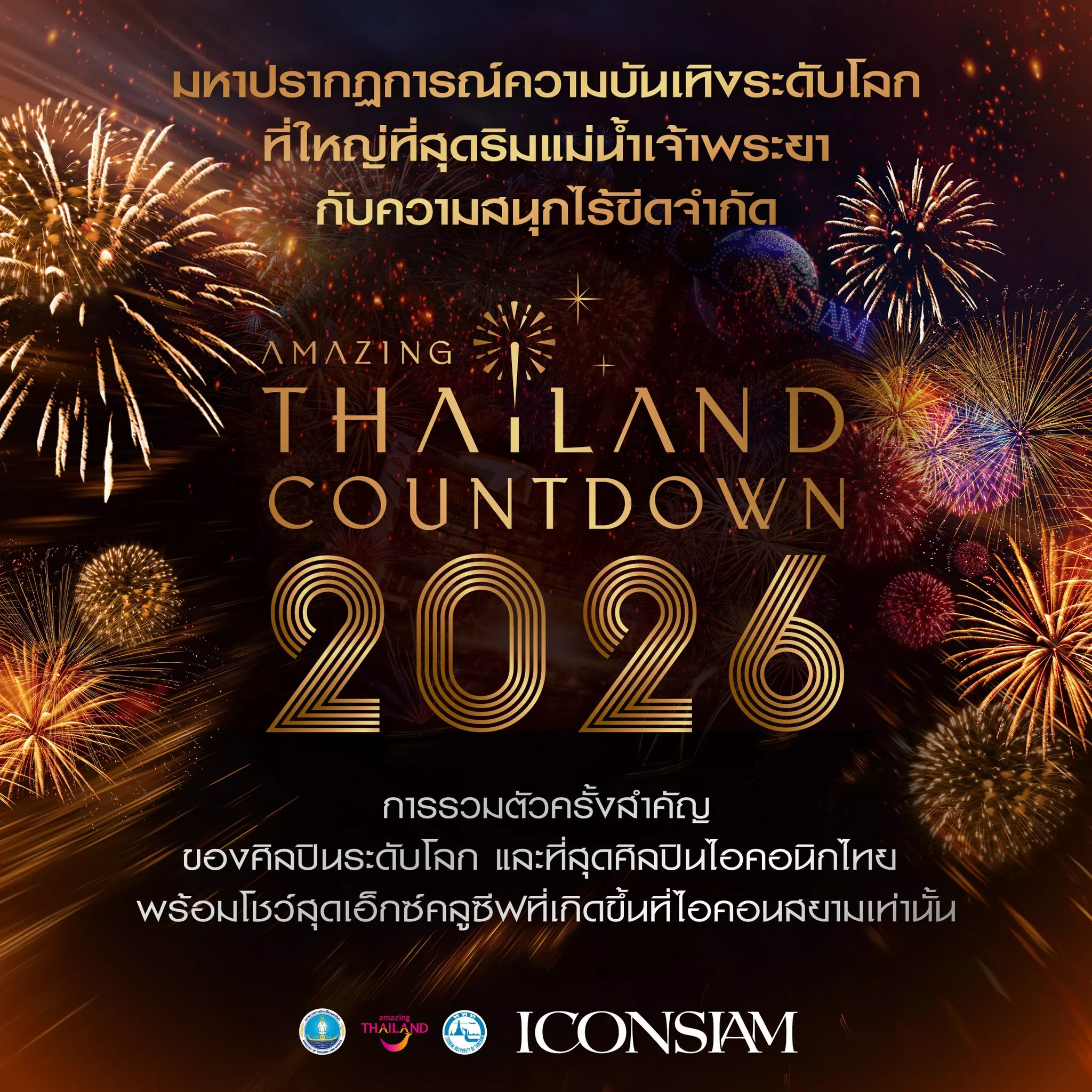 มาร่วมเป็นส่วนหนึ่งกับโมเมนต์ระดับโลกไปด้วยกัน ในงาน Amazing Thailand Countdown 2026 ตั้งแต่วันที่ 27-31 ธันวาคม 2568 ติดตามรายละเอียดและเงื่อนไขการรับสิทธิ์เข้าร่วมงานได้ทาง www.iconsiam.com หรือ Facebook: ICONSIAM พร้อมรับชมถ่ายทอดสดในคืนวันที่ 31 ธันวาคม ผ่านไทยรัฐทีวี ช่อง 32HD, ช่อง one31 และช่อง GMM25 รวมถึงช่องทางออนไลน์ อาทิ ไทยรัฐออนไลน์, one31, The Standard, ข่าวสด, มติชน และ Feed ตั้งแต่เวลา 23.00 น. เป็นต้นไป และรับชมทาง Facebook และ YouTube ICONSIAM ตั้งแต่เวลา 18.00 น. เป็นต้นไป สอบถามเพิ่มเติม โทร. 1338