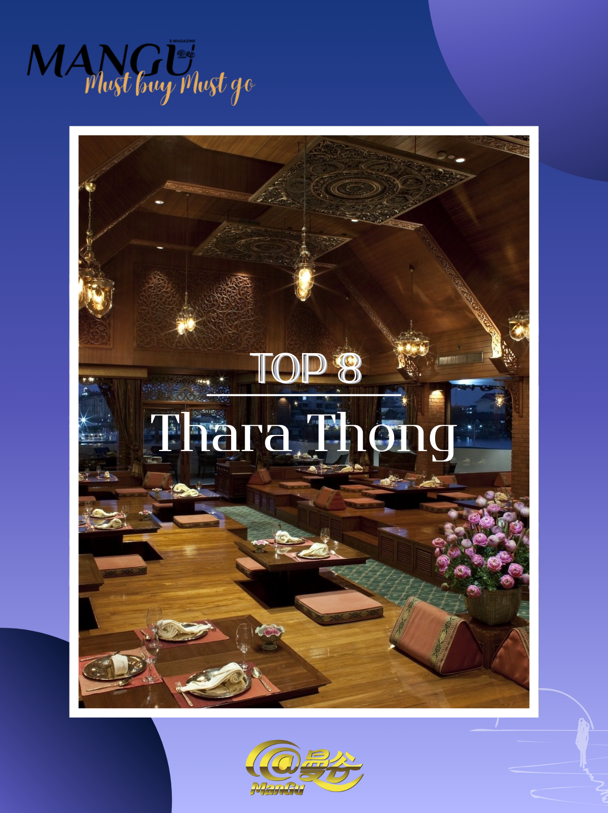 'ธาราทอง' ห้องอาหารไทยริมแม่น้ำเจ้าพระยา ที่ตกแต่งสไตล์ไทยด้วยไม้แกะสลัก และลวดลายไทย พร้อมกับที่นั่งแบบนั่งพื้น เหมือนนั่งทานอาหารอยู่ในเรือนไม้สักทอง
