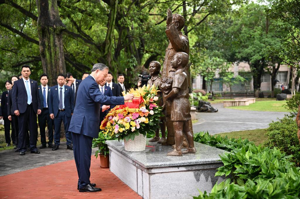 ช่วงเช้าวันที่ 17 เมษายน นายโต เลิม เลขาธิการใหญ่พรรคคอมมิวนิสต์เวียดนาม ประธานาธิบดีเวียดนามเดินทางเยี่ยมชม ณ นครหนานหนิง เขตปกครองตนเองกว่างซีจ้วงในโอกาสเยือนจีนอย่างเป็นทางการตามคำเชิญของนายสี จิ้นผิง เลขาธิการใหญ่พรรคคอมมิวนิสต์จีน ประธานาธิบดีจีน ภาพนี้คือนายโต เลิม ขณะวางกระเช้าดอกไม้คารวะรูปปั้นโฮจิมินห์ ณ อดีตที่ตั้งโรงเรียนอวี้ไฉ (เขตสถานศึกษาส่วนกลางของเวียดนาม) มหาวิทยาลัยกว่างซี ภาพโดย ไต๋ เทียนฟั่ง / สำนักข่าวซินหัว