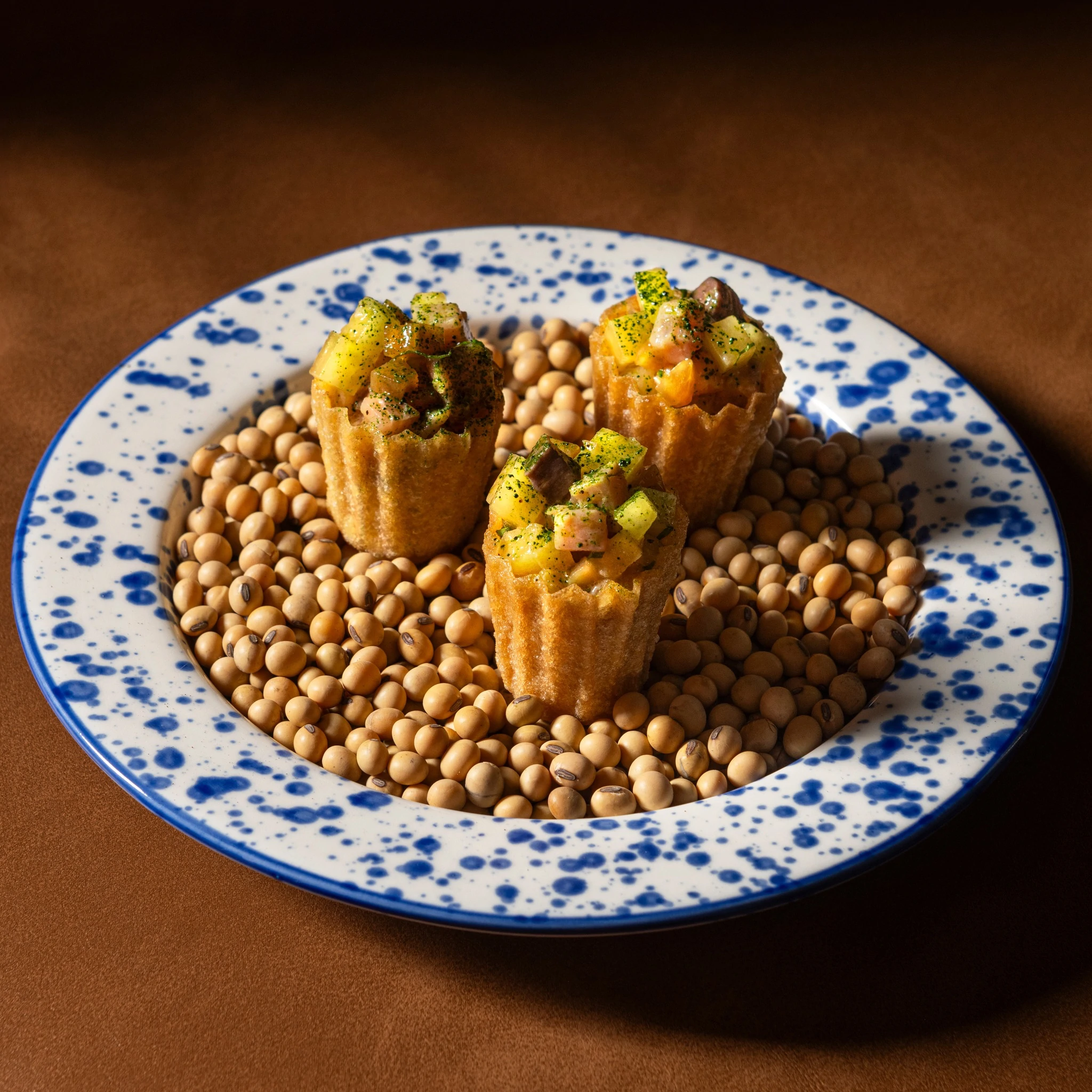 小食菜单同样充满实验精神:以经典娘惹点心Kueh Pie Tee为灵感的Hamachi Crudo Tart、配以发酵榴莲参巴的脆猪耳、甚至还有一款咸口可露丽——骨髓可露丽(Bone Marrow Canele)。 若想吃得扎实一些,来自泰国北部、采用泰日杂交和牛的Jasmine Wagyu(THB 750)绝对是值得一试的主角级选择。