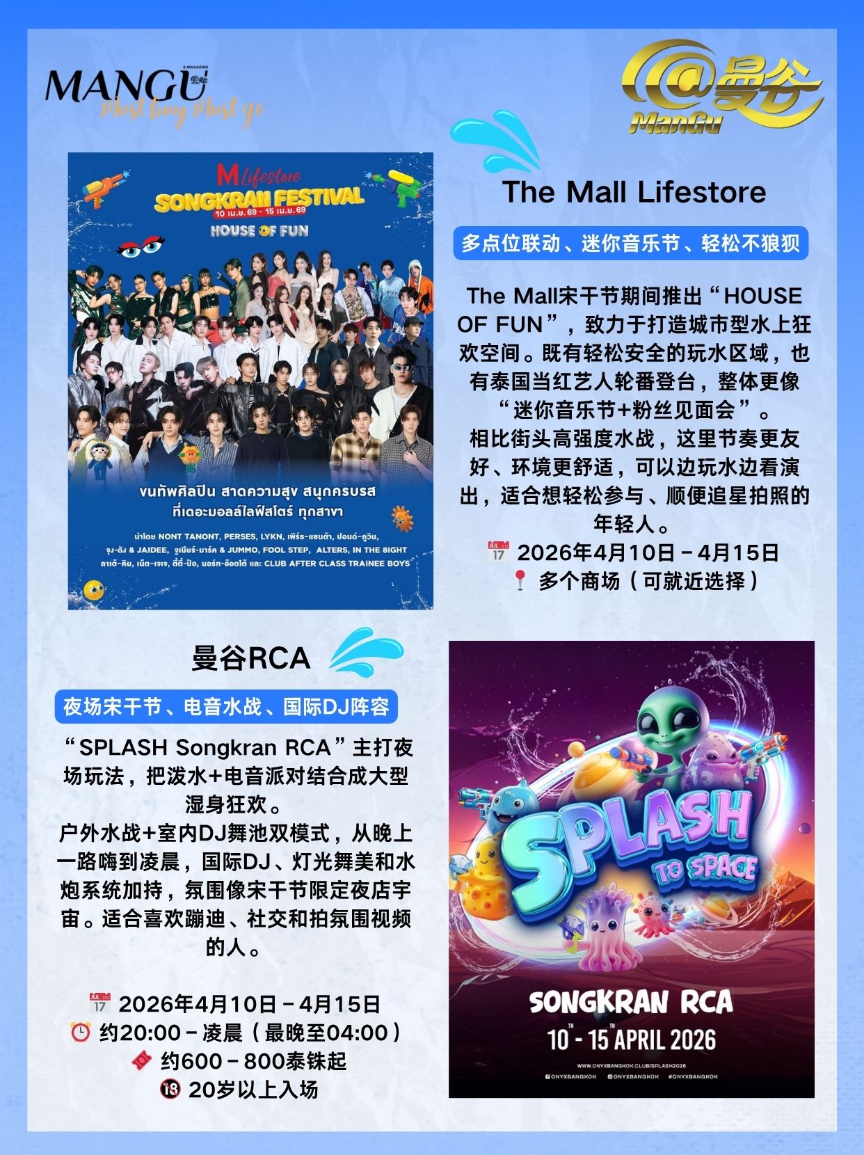 这一篇《@ManGu曼谷》杂志“必买必去”帮你把2026年最核心的9大主会场一次性梳理清楚:从第一次必去的经典主战场,到年轻人最爱的音乐水战区,再到适合拍照打卡、轻松体验的文化型场地,甚至连夜场蹦迪版宋干节都帮你安排好了。无论你是想“狠狠干一场水仗”,还是体验一个“创意泰式新年”,这份清单都能帮你选到最适合自己的玩法。