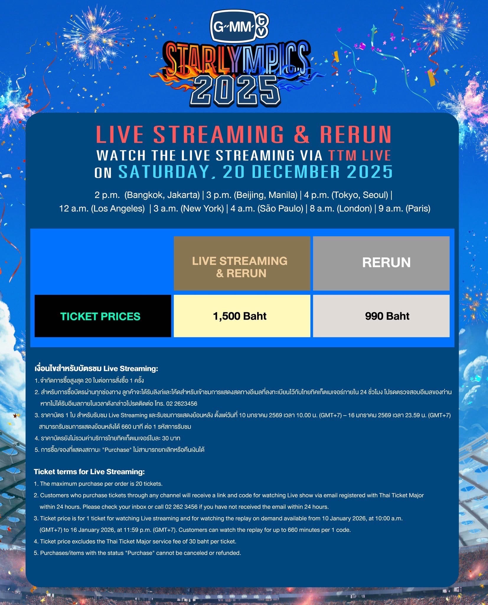 สำหรับผู้ที่สนใจเข้าร่วมงาน “GMMTV STARLYMPICS 2025” สามารถจับจองบัตรบนช่องทาง Online ในวันอาทิตย์ที่ 19 ตุลาคมนี้ เริ่มเวลา 10:00 น. เป็นต้นไป เปิดจำหน่ายทุกที่นั่ง ทางออนไลน์ที่ www.thaiticketmajor.com เท่านั้น และเปิดจำหน่ายบัตร ทุกช่องทางตามปกติ ในวันจันทร์ที่ 20 ตุลาคมนี้ เริ่มเวลา 10:00 น. เป็นต้นไป ทางไทยทิคเก็ตเมเจอร์ทุกสาขา, www.thaiticketmajor.com และ Call center โทร 0-2262-3456 บัตรราคา 1,500 / 2,000 / 2,500 / 3,000 / 4,000 / 4,500 / 5,000 / 5,500 และดูสดผ่าน TTM LIVE บัตรราคา Live Streaming+Rerun 1,500 บาท / Rerun 990 บาท (ลิงก์และโค้ดรับชม) กรณีต้องการรับบัตรพลาสติกที่ระลึก ชำระเพิ่ม 30 บาทต่อใบ ติดตามรายละเอียดเพิ่มเติมได้ที่เว็บไซต์ : www.thaiticketmajor.com, Facebook & Instagram & X & Tiktok & YouTube & Weibo : GMMTV