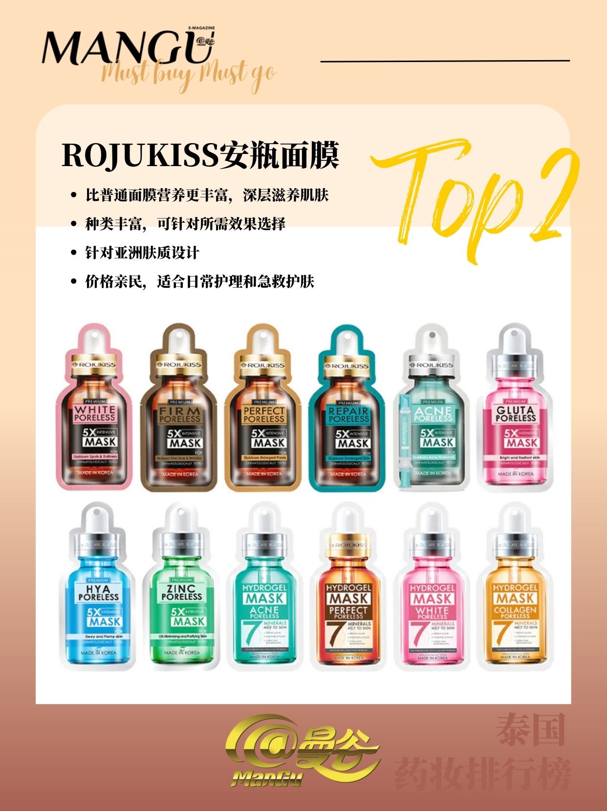 Top2 Rojukiss Mask — มาสก์แอมพูลที่รวมเอสเซนส์เข้มข้น เหมาะสำหรับผิวแห้ง ผิวหมองคล้ำ สีผิวไม่สม่ำเสมอ หรือปัญหารูขุมขน มีหลายสูตรให้เลือก ช่วยฟื้นฟูผิวได้อย่างรวดเร็ว