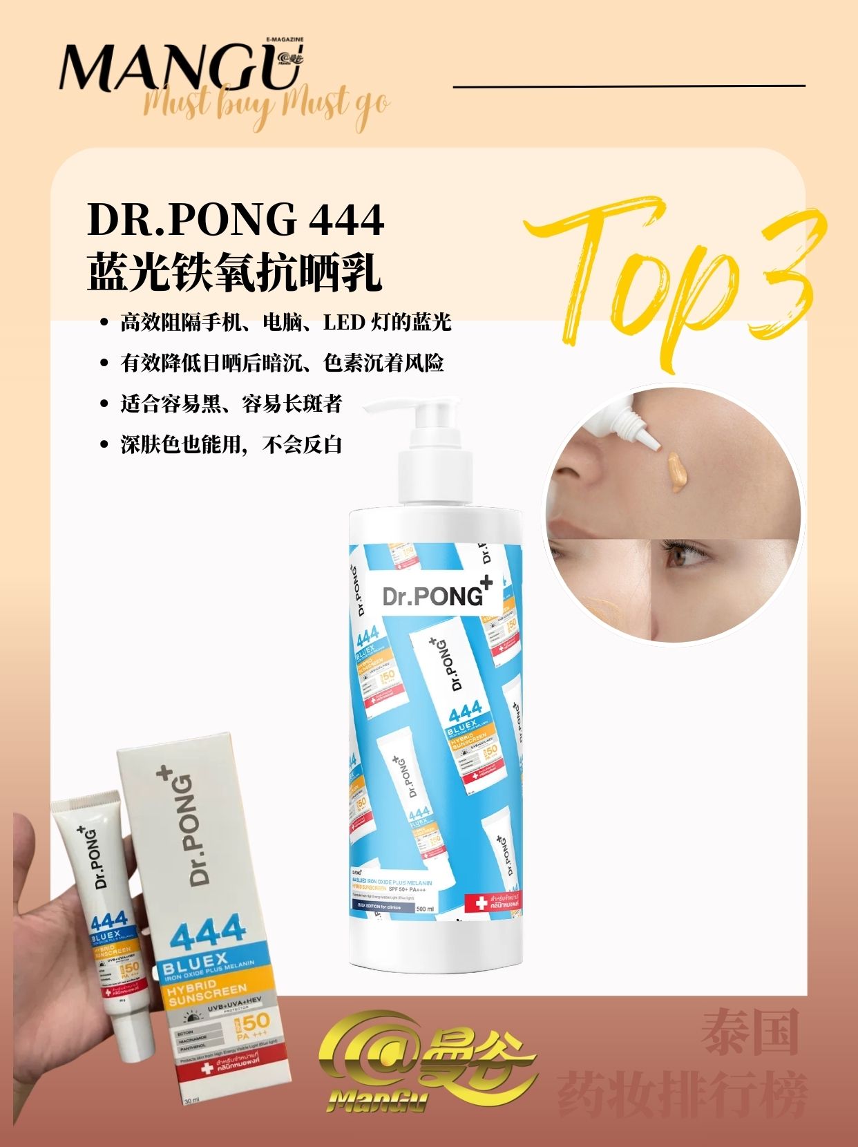 Top3 Dr.PONG 444 BlueX iron oxide plus melanin hybrid sunscreen SPF50 PA+++ — กันแดดที่ออกแบบมาสำหรับสภาพอากาศร้อนและแสงแรงในเอเชียตะวันออกเฉียงใต้ ป้องกัน UVA / UVB + แสงสีฟ้า + แสงที่มองเห็น เหมาะกับคนกลัวผิวคล้ำหรือเกิดฝ้า กระ จุดด่างดำ