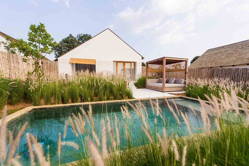 เมื่อเข้าไปในห้องจะพบกับสระน้ำที่ใสระยิบระยับ โดยข้างสระน้ำยังมีเก้าอี้และโซฟาไว้พักผ่อนหย่อนใจ ภายนอกของห้องนั้นเป็นสีขาวสะอาด ในส่วนของภายในห้องยังมีการจัดวางตำแหน่งได้อย่างลงตัว เตียงใหญ่ที่แสนสบาย เมื่อเปิดผ้าม่านก็ยังสามารถชมวิวทิวทัศน์ของธรรมชาติได้อีกด้วย ภายในห้องน้ำยังมีกระจก อ่างล้างหน้า ผ้าขนหนู ชั้นวางของ และโคมไฟสีเหลืองวินเทจ ที่สามารถชมความงามและศิลปะแบบไทยๆได้อีกด้วย