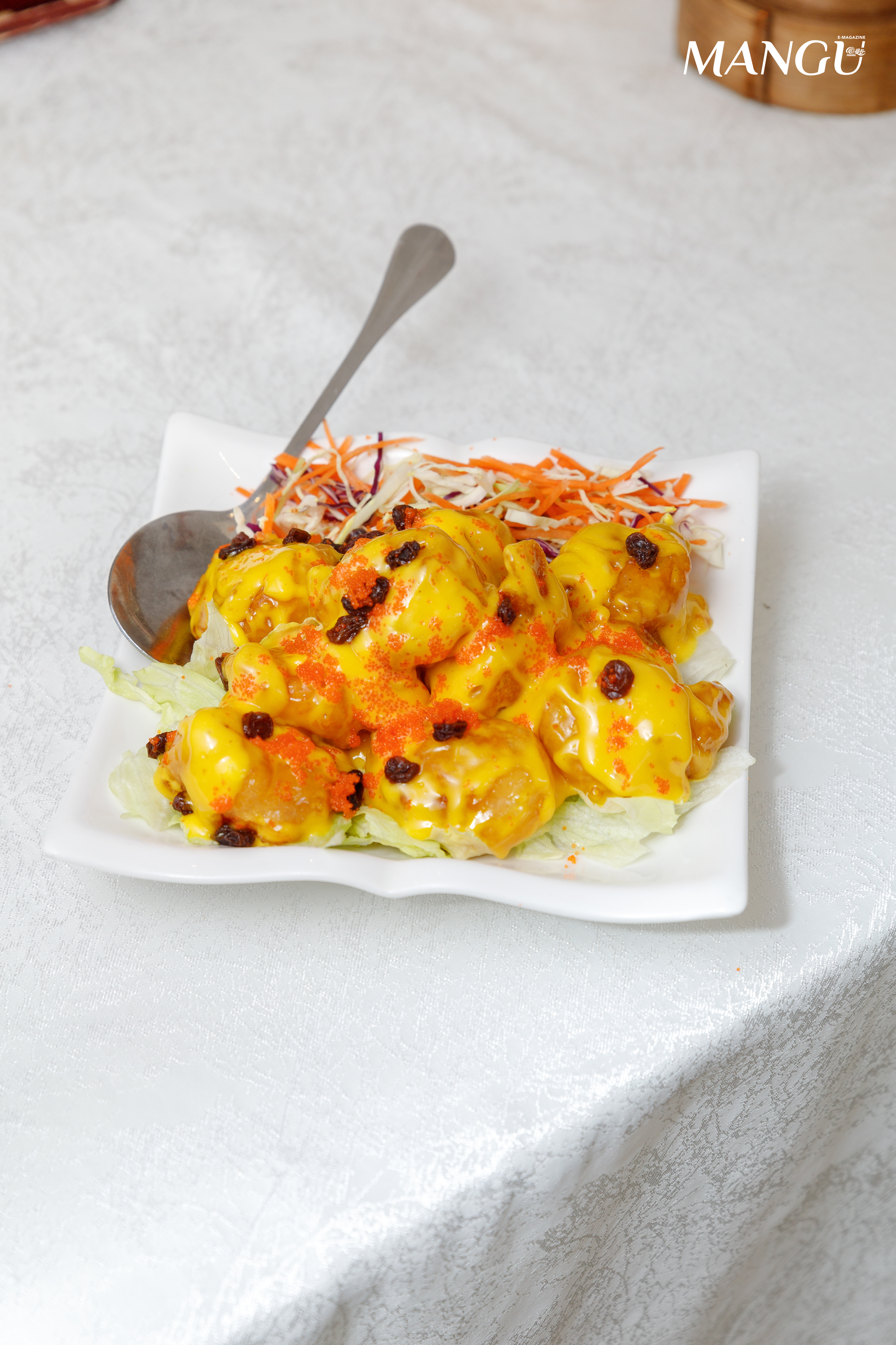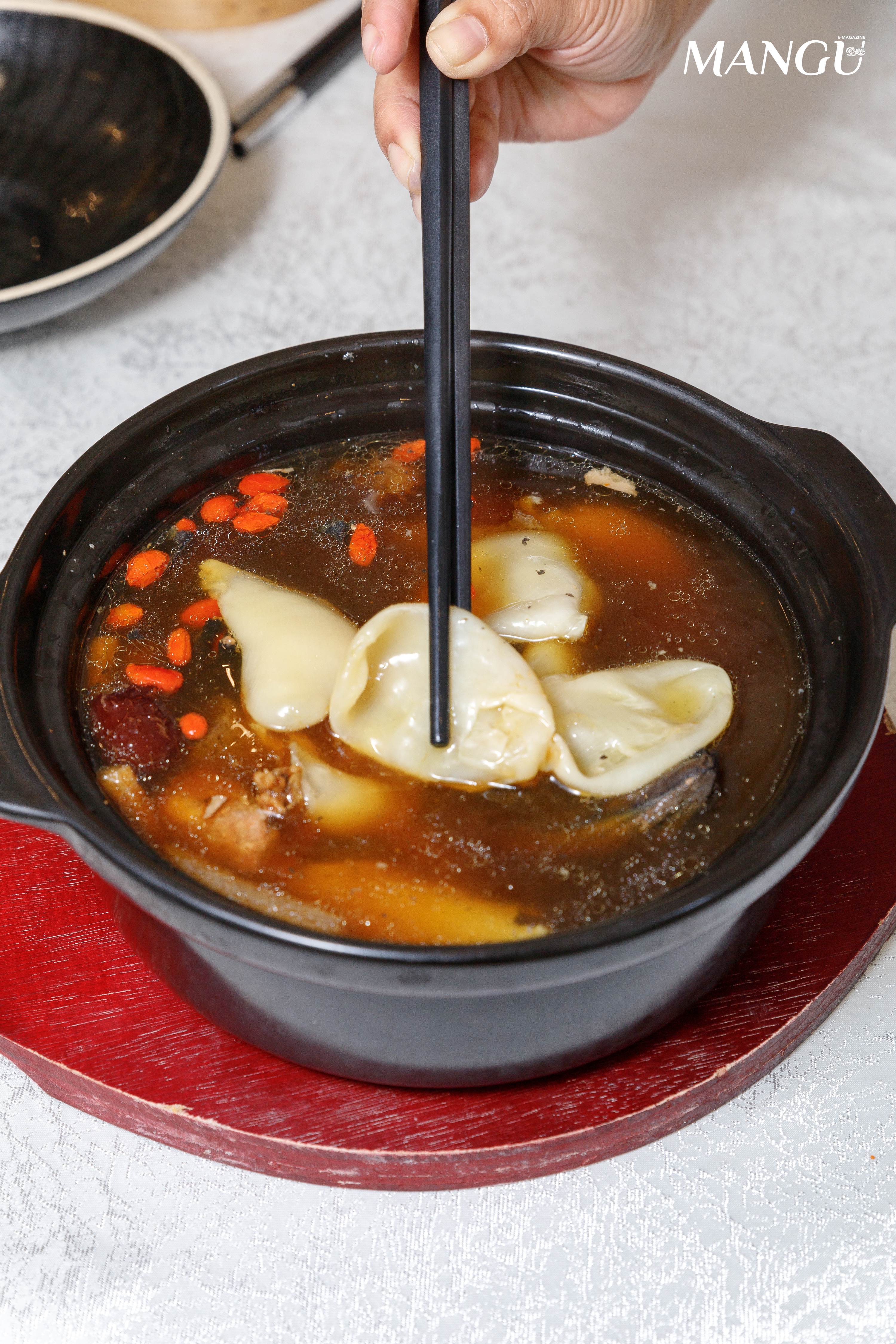อย่างแรกคือเป็ดย่างหนังกรอบ หนังกรอบจนน้ำลายสอ เมื่อกัดลงไป ไขมันจะล้นออกมาและเนื้อเป็ดแน่น ๆ ทำให้คนได้ลิ้มลองลืมไม่ลง ตามด้วยลูกชิ้นกุ้งผัดมัสตาร์ด จานนี้มัสตาร์ดสีเหลืองห่อกุ้งทอดทั้งตัว มีรสชาติเข้มข้นและวัตถุดิบของแท้ ทานคู่กับผักสดช่วยลดความเลี่ยนได้ดี กุ้งอบวุ้นเส้นเป็นอาหารจานเด็ด มีรสชาติที่เข้มข้น วุ้นเส้นเต็มไปด้วยความอร่อยของกุ้งและความหอมเค็มของซอสกระเทียม ไก่ดำตุ๋นยาจีนเป็นอาหารที่มีคุณค่าทางโภชนาการ กระเพาะปลา แฮมยูนนาน ไก่ดำผสมผสานกับสมุนไพรบำรุงร่างกายนานาชนิด ช่วยเสริมสร้างความงามอ่อนวัย บำรุงอวัยวะที่หมดสภาพให้กลับฟื้นคืนเป็นปกติ