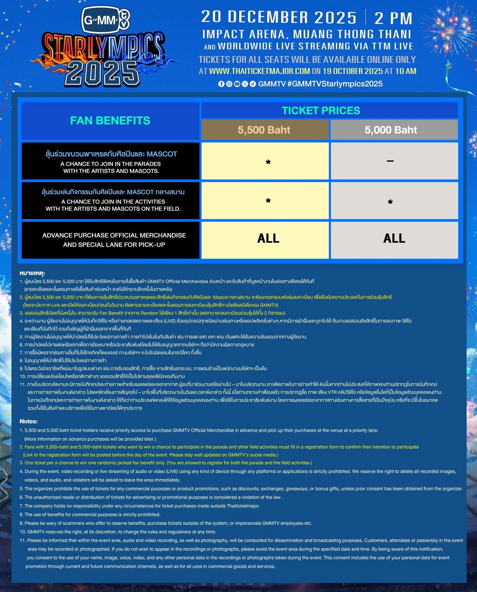 สำหรับผู้ที่สนใจเข้าร่วมงาน “GMMTV STARLYMPICS 2025” สามารถจับจองบัตรบนช่องทาง Online ในวันอาทิตย์ที่ 19 ตุลาคมนี้ เริ่มเวลา 10:00 น. เป็นต้นไป เปิดจำหน่ายทุกที่นั่ง ทางออนไลน์ที่ www.thaiticketmajor.com เท่านั้น และเปิดจำหน่ายบัตร ทุกช่องทางตามปกติ ในวันจันทร์ที่ 20 ตุลาคมนี้ เริ่มเวลา 10:00 น. เป็นต้นไป ทางไทยทิคเก็ตเมเจอร์ทุกสาขา, www.thaiticketmajor.com และ Call center โทร 0-2262-3456 บัตรราคา 1,500 / 2,000 / 2,500 / 3,000 / 4,000 / 4,500 / 5,000 / 5,500 และดูสดผ่าน TTM LIVE บัตรราคา Live Streaming+Rerun 1,500 บาท / Rerun 990 บาท (ลิงก์และโค้ดรับชม) กรณีต้องการรับบัตรพลาสติกที่ระลึก ชำระเพิ่ม 30 บาทต่อใบ ติดตามรายละเอียดเพิ่มเติมได้ที่เว็บไซต์ : www.thaiticketmajor.com, Facebook & Instagram & X & Tiktok & YouTube & Weibo : GMMTV