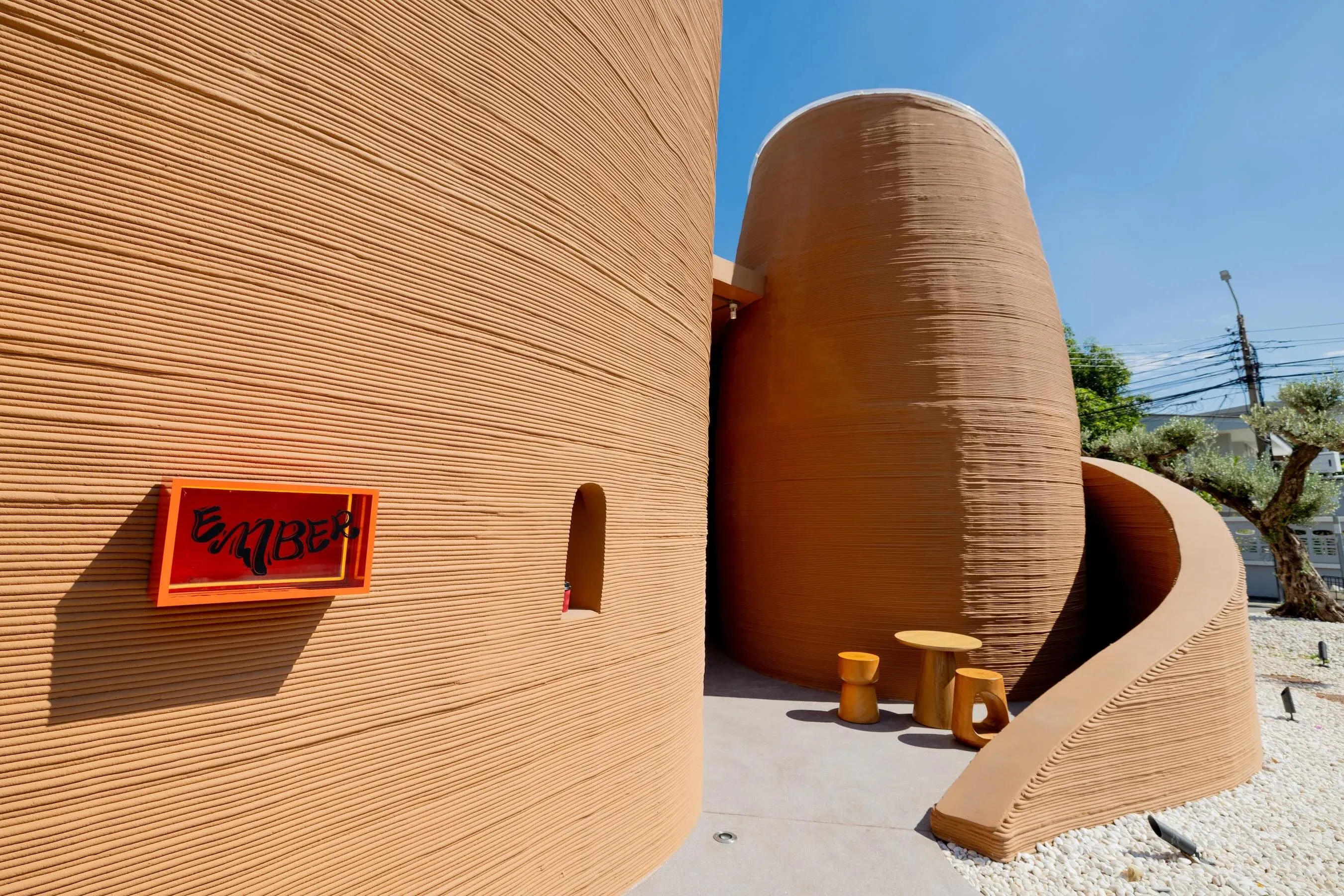 ซ่อนตัวอยู่ในตรอกเงียบ ๆ ของย่านเมืองเก่ากรุงเทพฯ EMBER Cafe & Wine ใช้อาคารที่สร้างด้วยเทคโนโลยีพิมพ์สามมิติ สร้างนิยามใหม่ให้พื้นที่พักผ่อนในเมือง เส้นสายสีเทาขาวที่คมชัดในเวลากลางวันและนุ่มละมุนในยามค่ำ ทำให้เทคโนโลยีและความละมุนอยู่ด้วยกันอย่างพอดี