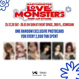 พิเศษสุด! เมื่อซื้อสินค้า BABYMONSTER ใน “LOVE MONSTERS POP-UP STORE” ครบทุก 2,000 บาท รับทันที โฟโต้การ์ดลิมิเต็ดเฉพาะ POP-UP STORE ไทย แบบสุ่ม 1 ใบ (จำนวนจำกัด หมดแล้วหมดเลย)