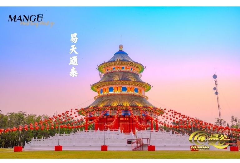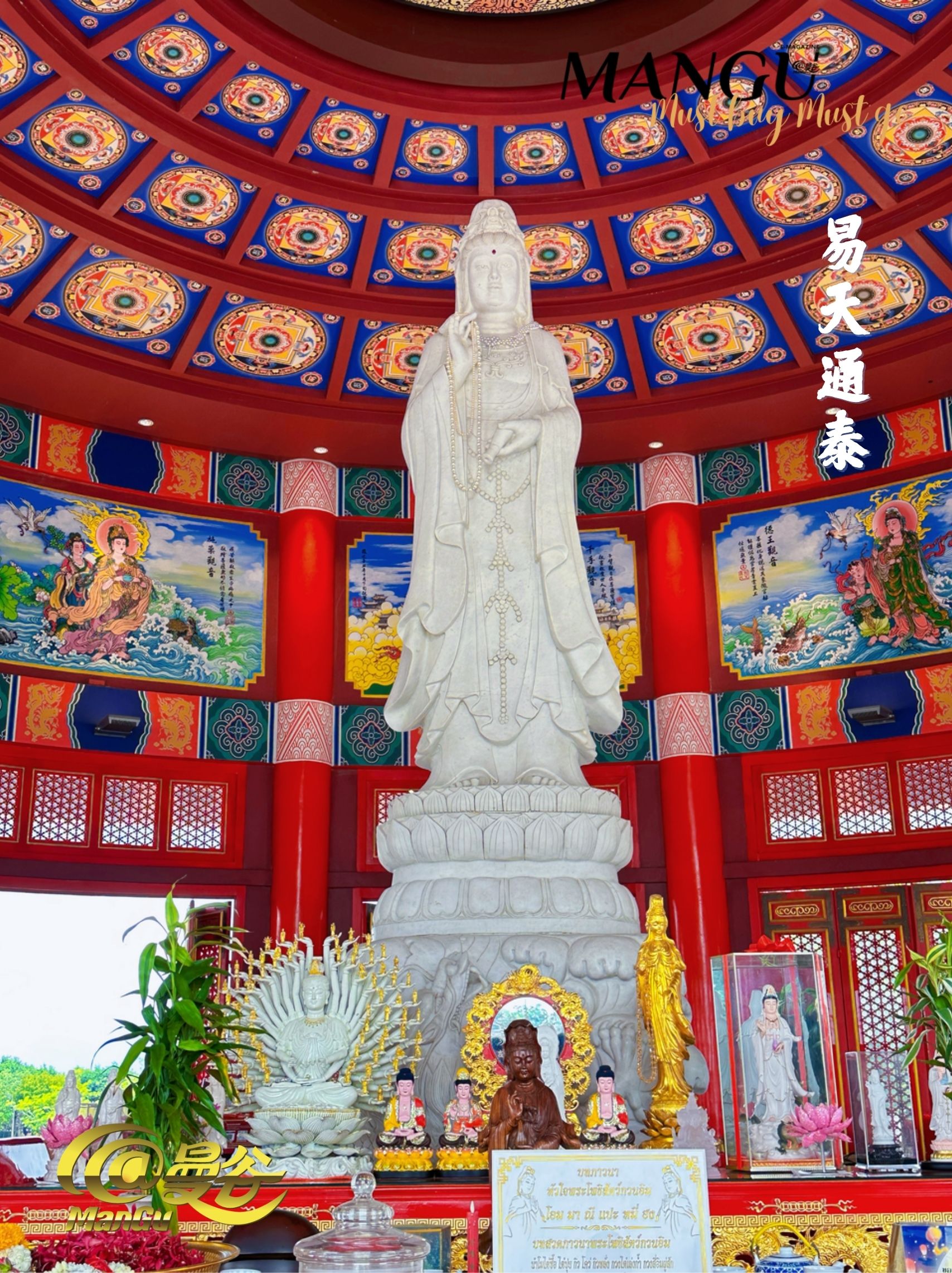 巴真府的“易天通泰”以中泰融合的建筑与信仰闻名,是近年来新晋的寺庙打卡圣地,也被誉为亚洲最大白玉观音庙。寺庙核心为按1:2比例复刻北京天坛的三重檐殿宇,绿色琉璃瓦融入太阳能科技,殿内供奉全亚洲最大整块白玉“赐福观音”,由缅甸深山白玉开采,经北京匠人多年雕琢而成,高近5米、重逾14吨,玉质莹润,气韵庄严。殿内24根立柱象征十二月与十二时辰,信众可扶柱祈愿,与天地共感。该圣地由协成昌集团主席李文祥出资兴建,是中泰文化与工艺交融的象征,也成为游客和信众的新晋必访之地。