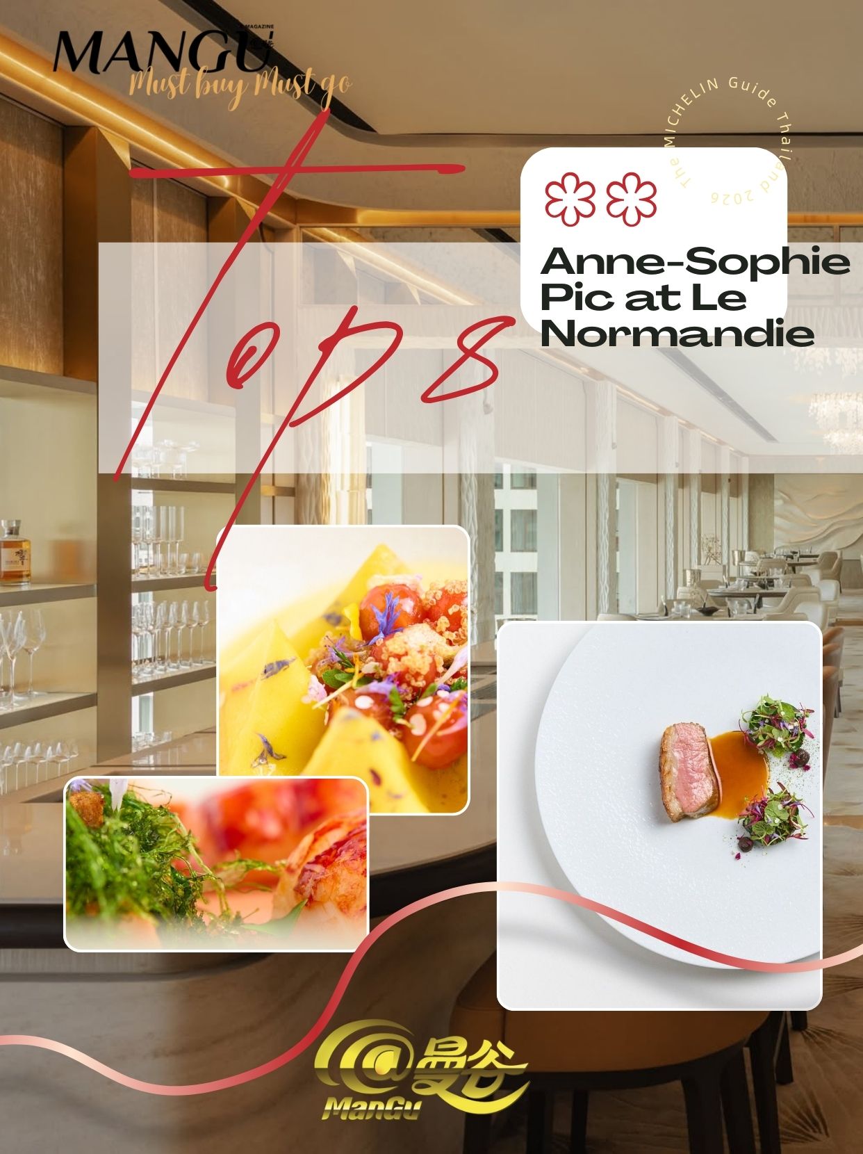 餐厅介绍:Anne-Sophie Pic at Le Normandie 是泰国曼谷最具历史意义的法国高级料理餐厅之一,承载着自1958年起Le Normandie在亚洲fine-dining领域的辉煌传统。2026 年荣获米其林二星,标志着这家传奇餐厅在全新篇章中的卓越表现,同时也是世界上拥有最多米其林星的女主厨 Anne-Sophie Pic带来其独特艺术语言的重要里程碑。 她以法国烹饪的精准细腻为根基,同时融合极具表现力的风味结构,让传统的法式料理在泰国这片丰富多元的土地上重获新生,并与本地文化产生对话。