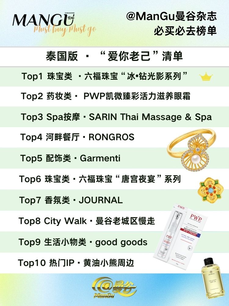 而在泰国相对松弛的生活节奏、多元而包容的审美环境,让“为自己做选择”变得更自然,也更少负担。你不需要向任何人证明什么,只需要对自己的感受负责。也正是在这样的背景下,本期“《@ManGu曼谷》杂志必买必榜单”重新整理了这份“泰国版 · 爱你老己清单”。 我们看到,一些决定不再以即时满足为导向,而是围绕未来的安全感展开;一些体验被认真对待,只因为它们能让紧绷的状态短暂停下来;也有一些看似不具备功能性的存在,却在日复一日中提供了难以替代的陪伴与安心。这些变化,正在重塑人们对“值得”的理解。