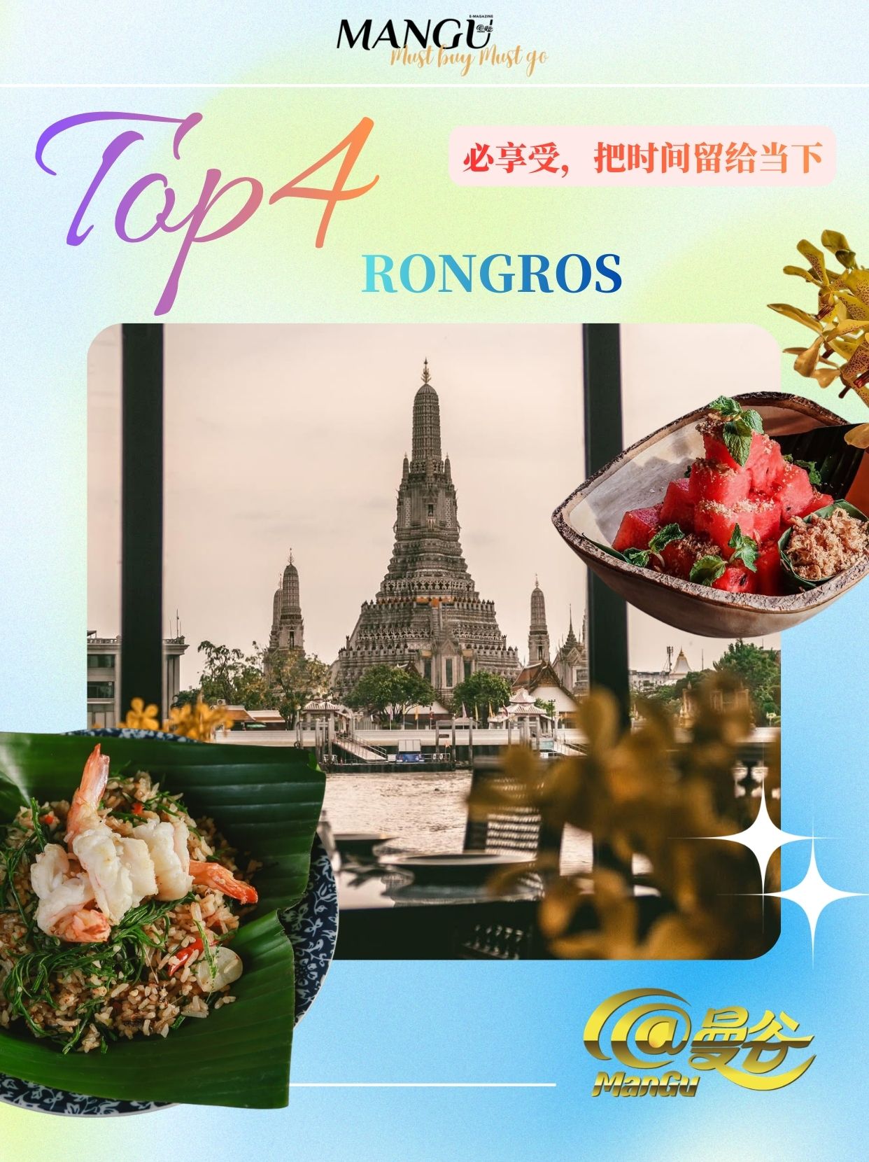 RONGROS坐落于湄南河畔,正对郑王庙,是近年在曼谷颇受欢迎的河景餐厅之一。餐厅以现代泰式料理为主,菜式不刻意复杂,但在口味与呈现上都保持稳定水准。傍晚到夜晚的河景让用餐节奏自然慢下来,也让这一餐本身成为一种享受的理由。它适合被安排在旅行或日常中的某个夜晚——不为打卡,也不需要特殊意义,只是单纯地为“把时间留着当下”而来。