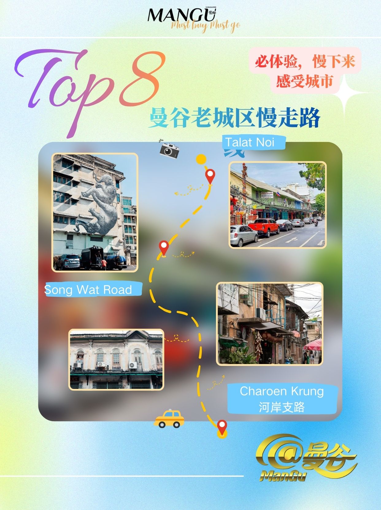 从《姥姥的外孙》华裔老社区Talat Noi出发,穿过保留完好的老仓库与街区,再走到近年逐渐活跃的Song Wat Road,一路能看到老城区被重新使用的样子。沿着Charoen Krung靠河的支路前行,人不多、节奏慢,适合边走边停。这条路线不强调打卡点,而是让人自然放慢脚步,在城市的新旧交错中,找回对当下的感受。