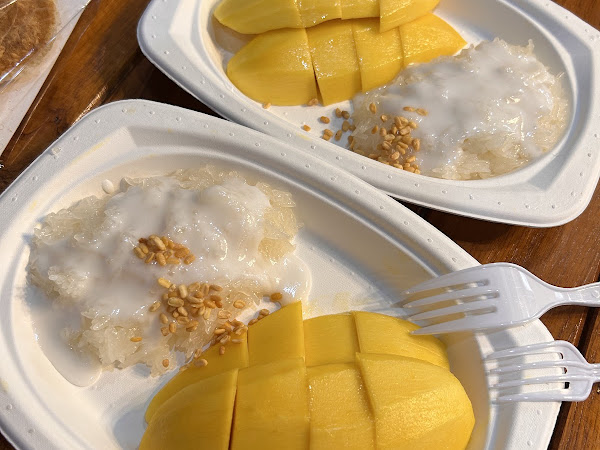 芒果糯米饭特色:糯米采用传统蒸汽反复蒸制,颗粒饱满却不黏牙;椰奶刻意保留微咸风味,用来平衡成熟芒果的天然甜度。芒果切得厚,熟度控制精准,比例几乎成为后来者参考的范本,是典型的“教科书级芒果糯米饭”。
