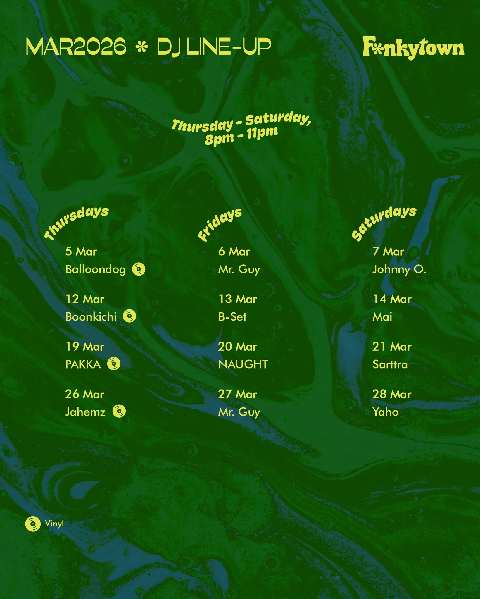 在Funkytown,音乐从来不是背景,而是整个体验的骨架。播放清单横跨Funk、Soul、R&B与80年代迪斯可,每逢周四至周六,曼谷最炙手可热的黑胶与数字DJ将亲临现场献艺。