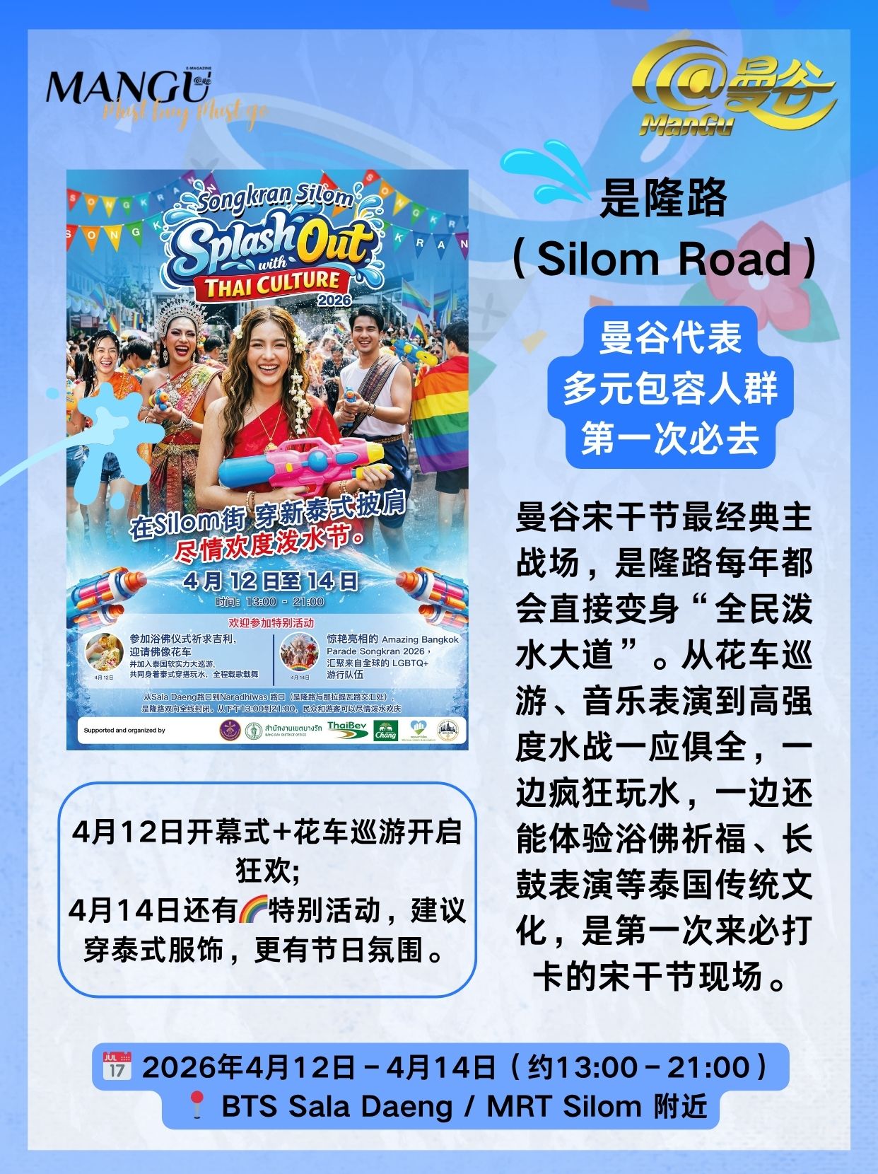 这一篇《@ManGu曼谷》杂志“必买必去”帮你把2026年最核心的9大主会场一次性梳理清楚:从第一次必去的经典主战场,到年轻人最爱的音乐水战区,再到适合拍照打卡、轻松体验的文化型场地,甚至连夜场蹦迪版宋干节都帮你安排好了。无论你是想“狠狠干一场水仗”,还是体验一个“创意泰式新年”,这份清单都能帮你选到最适合自己的玩法。